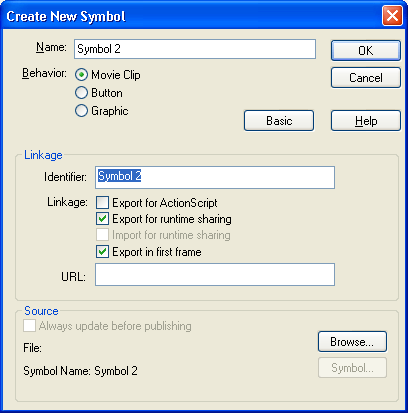 символ следует сделать доступным в сценарии на ActionScript, установите флажок